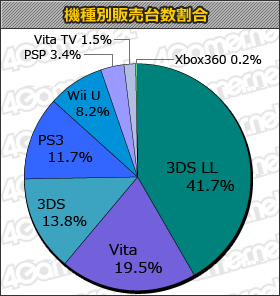 | 機種 | 販売台数 | | 3DS LL | 36,306 | | Vita | 16,951 | | 3DS | 12,002 | | PS3 | 10,240 | | Wii U | 7,180 | | PSP | 2,948 | | Vita TV | 1,331 | | Xbox 360 | 194 |