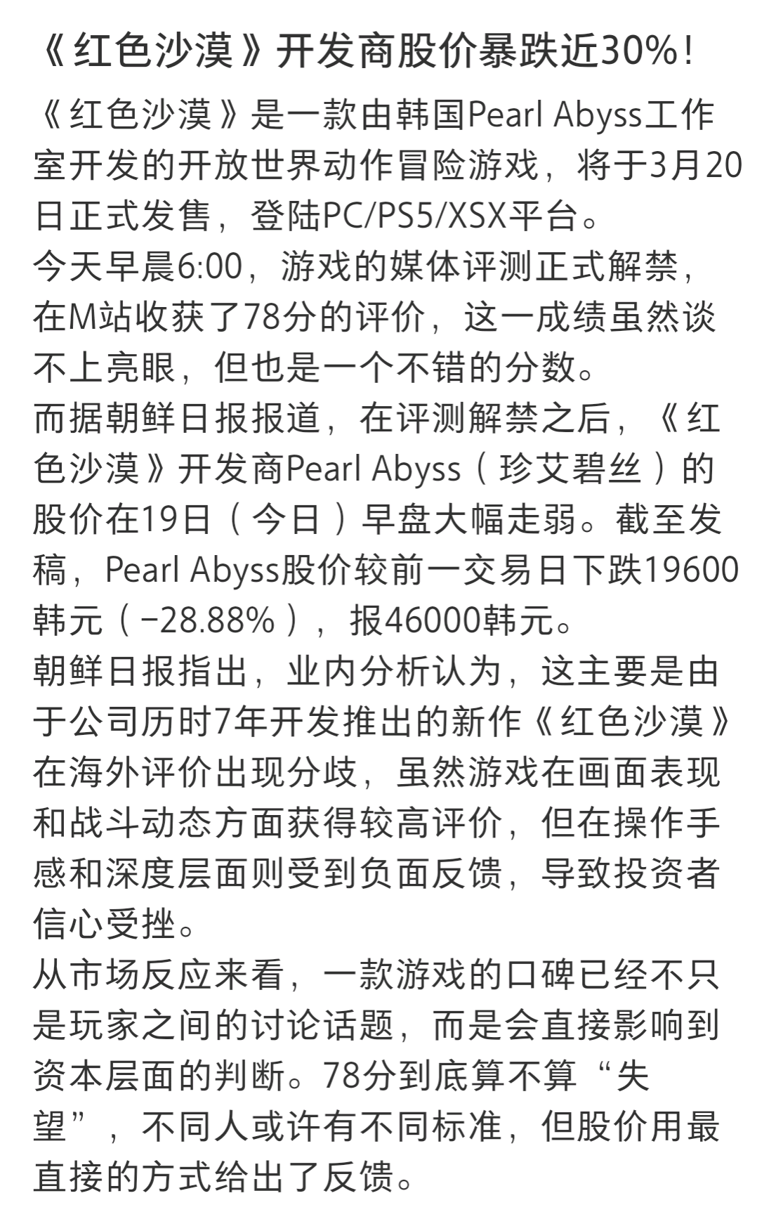 《红色沙漠》开发商股价暴跌近30% |