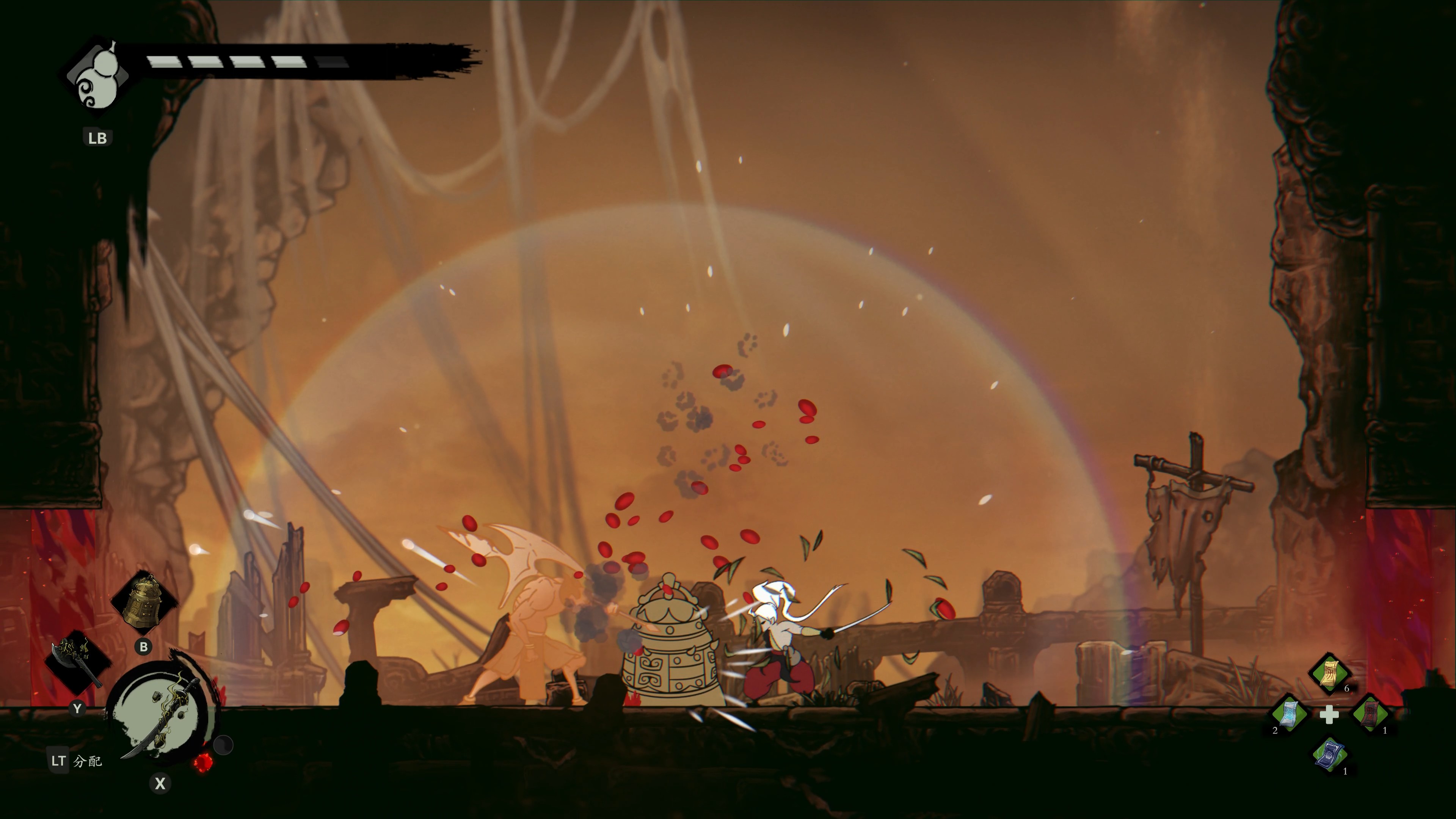 游戏的战斗核心循环和《空洞骑士》有些相似,使用普通攻击命中敌人会产生“炁”(能量),使用法宝的特殊技能需要消耗“炁”。当消耗炁的技能命中敌人时,会生成“灵”(击杀敌人同样会掉落灵)。吸收“灵”可以为身上的葫芦充能,从而为主角提供生命值恢复。