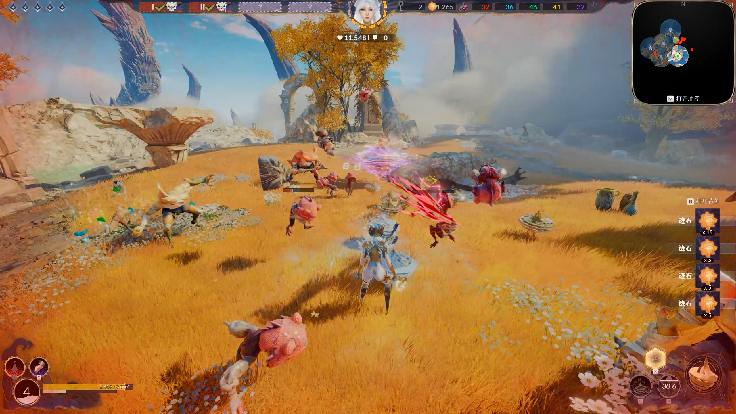 游戏中每个地图、每个章节的玩法都不一样。在这次试玩的地图中,采用了节奏较快的30分钟单局设计并融合了塔防玩法。每一局开始,玩家从天而降,完成初始构筑后,需要在广阔的地图上探索,收集词条,强化自身。在这个过程中,每间隔一段固定时间(如8分钟),便会迎来一波狂潮式的塔防波次,届时地图上会出现传送光柱,玩家需要迅速返回大本营守护核心目标,以此验证这段时期内的构筑成果。在成功防守三轮之后,玩家将迎来最终的BOSS决战,接受终极的战力考验。如果你对自己的战斗力足够自信的话,也可以在大本营提前吹响号角来召唤下一波敌人。此外,游戏地图中还设计了一些需要特定条件才能进入的隐藏区域和提供高效位移的局内载具,用以丰富探索体验并提升跑图效率。